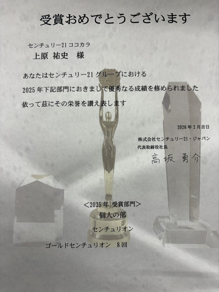 内容は2025年1月から12月の取引報酬額が一定以上の成績の営業マンが表彰されるのですが、全国のセンチュリー21の営業の約5%のみが得られる称号それが【センチュリオン】